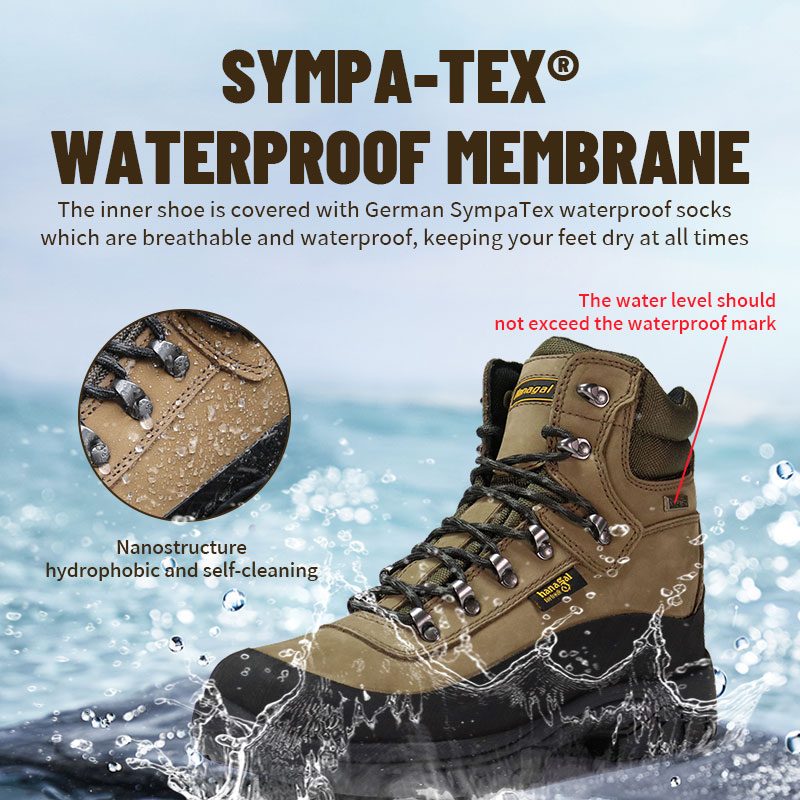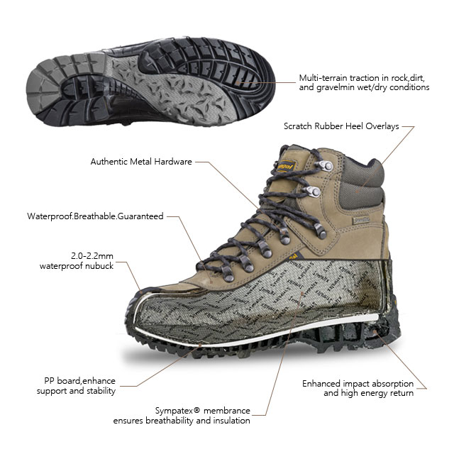 A parte interna do calçado é forrada com meias impermeáveis alemãs Sympatex, respiráveis e impermeáveis, mantendo os pés sempre secos.