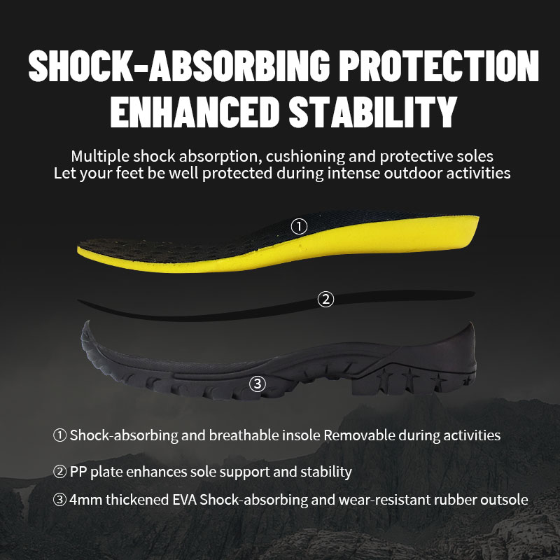 ①Palmilha almofadada e respirável – removível quando você precisar limpá-la ou trocá-la. ②Reforçado com uma placa PP para suporte extra sob os pés - para que cada passo pareça sólido e controlado. ③ Sola de borracha EVA espessada de 4 mm com absorção de choque e resistente ao desgaste.