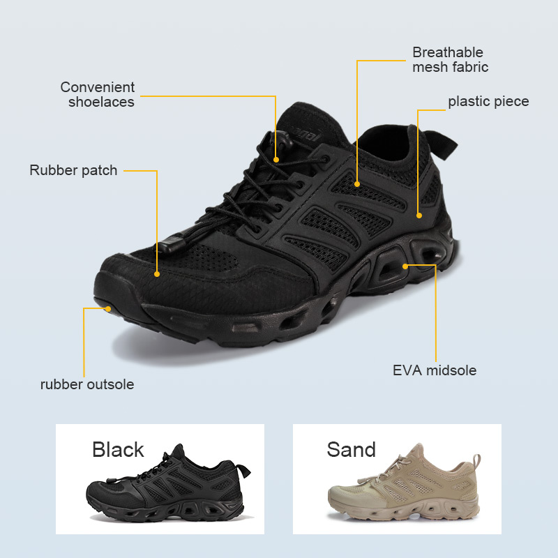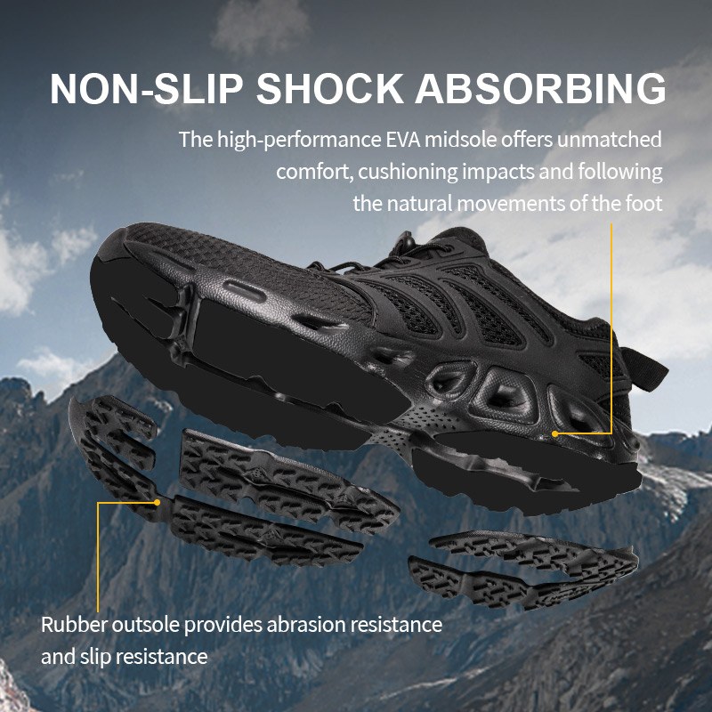 Esses tênis de trekking EVA com absorção de choque estão em estoque e prontos para envio, com pedidos a partir de apenas 10 pares. Para mais detalhes ou dúvidas sobre preços, sinta-se à vontade para entrar em contato a qualquer momento. A personalização também está disponível com pedido mínimo de 800 pares. E este modelo tem as seguintes vantagens: