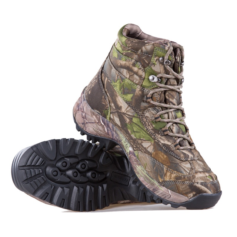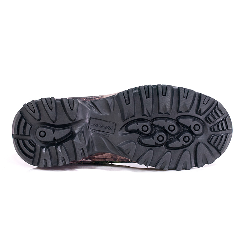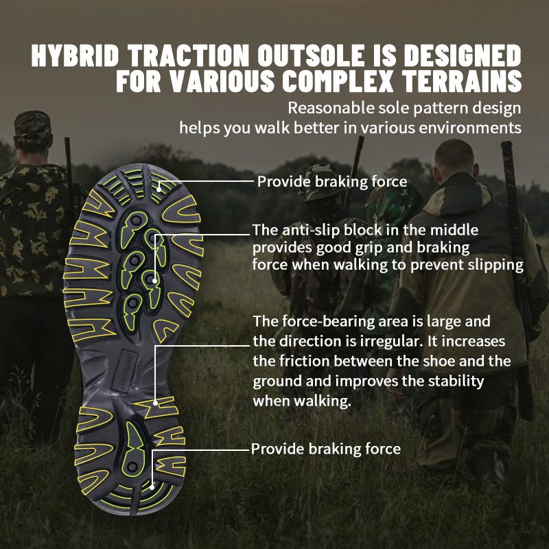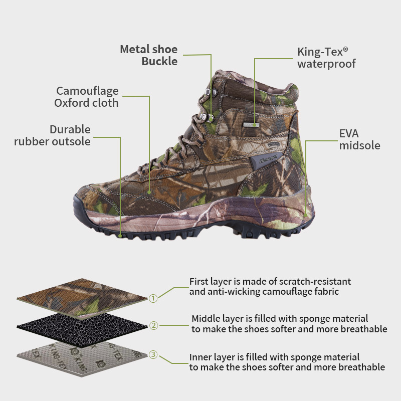 ①A palmilha poliyou de alta elasticidade e absorção de umidade mantém o interior seco. ②Entressola em EVA, envolta em tecido camuflado, amortecimento e absorção de choque. ③Sola de borracha durável, antiderrapante e resistente ao desgaste.