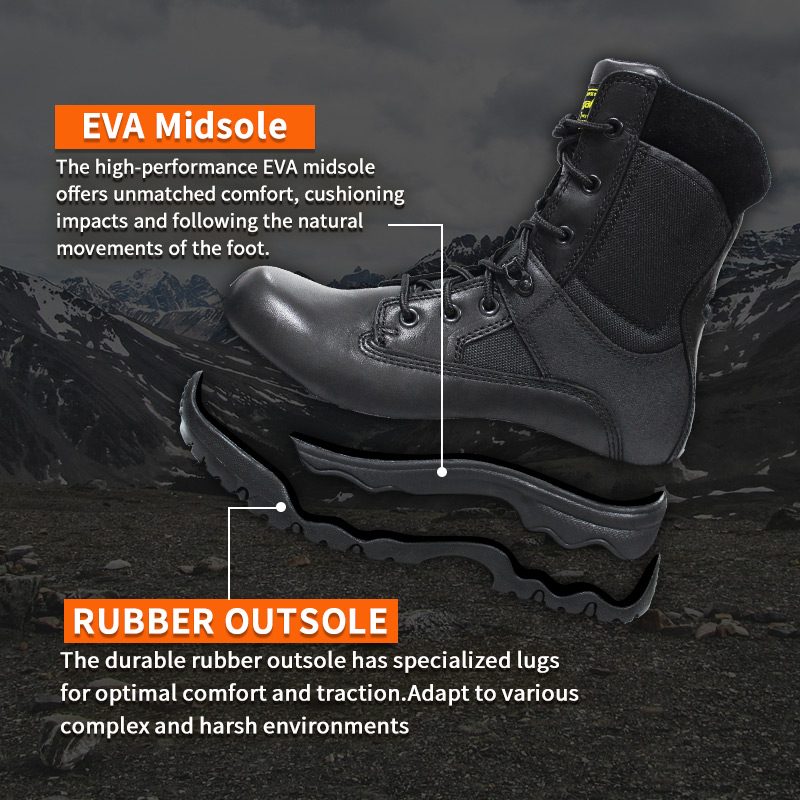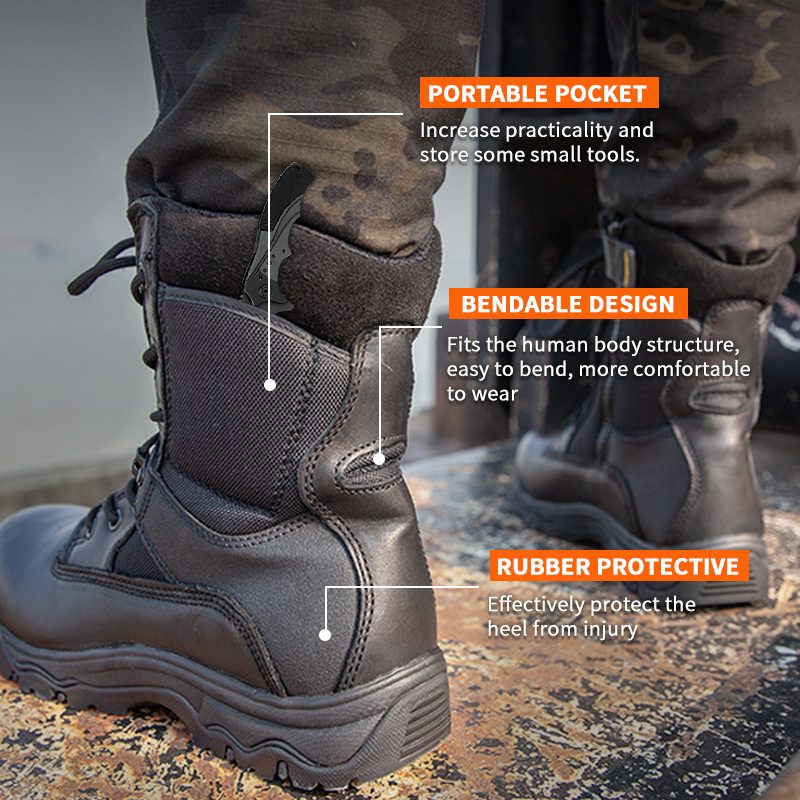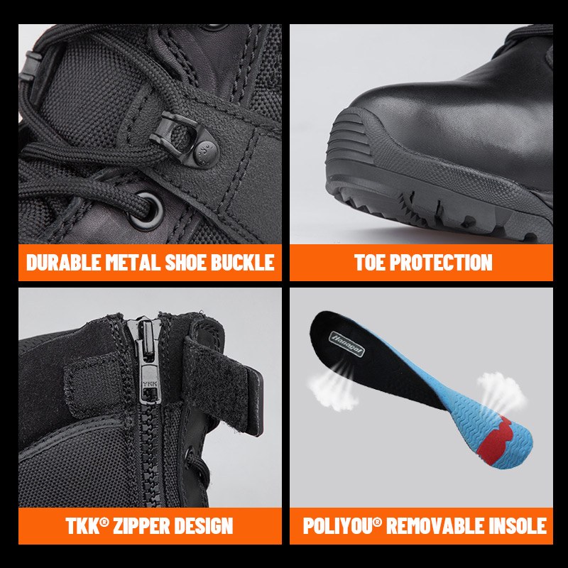 Essas botas policiais de couro de flor integral com zíper YKK estão disponíveis para personalização em cores, materiais e detalhes, com MOQ de 800 pares, ideais para colaborações de marcas e compras em grupo. E estas botas de caça têm as seguintes vantagens:
